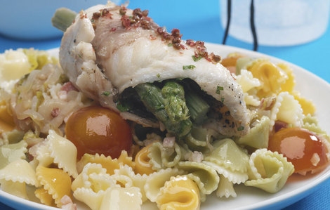 Tempere os filetes com sal, pimenta e salsa picada e sobre cada um coloque dois espargos. Enrole-os e prenda-os com palitos grandes. Coloque os rolos numa assadeira, regue-os com azeite e espalhe por cima a pimenta rosa. Leve ao forno preaquecido durante, aproximadamente, dez minutos. Entretanto, coza a massa al dente em água temperada com sal. Refogue ligeiramente 3 c. (sopa) de azeite com o bacon e a chalota picados e a endívia em juliana. Adicione os tomates-cereja cortados em metades e regue com uma concha da água de cozer a massa. Apure e aromatize com o vinagre. Junte a massa escorrida e salteie tudo rapidamente. Sirva a massa com os rolos de peixe.