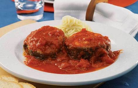 Limpe o peixe e lave-o em água corrente. Tempere as postas com pouco sal e o sumo de limão. Aguarde 15 minutos. Passe as postas por farinha e doure-as rapidamente numa frigideira com azeite. Escalde o tomate e pele-o. Corte-o às fatias e deite no fundo de uma caçarola antiaderente com um pouco de azeite. Adicione a malagueta cortada às rodelas sem sementes. Disponha por cima as postas de peixe e regue com um pouco mais de azeite. Polvilhe com bastante salsa picada, tape o recipiente e cozinhe em lume brando durante cerca de 20 minutos. Retifique os temperos e sirva quente com puré de batata.